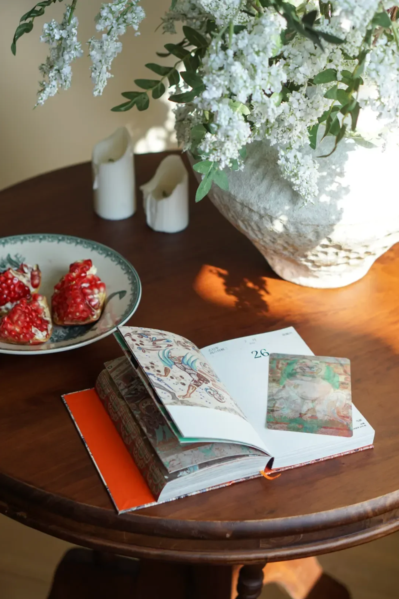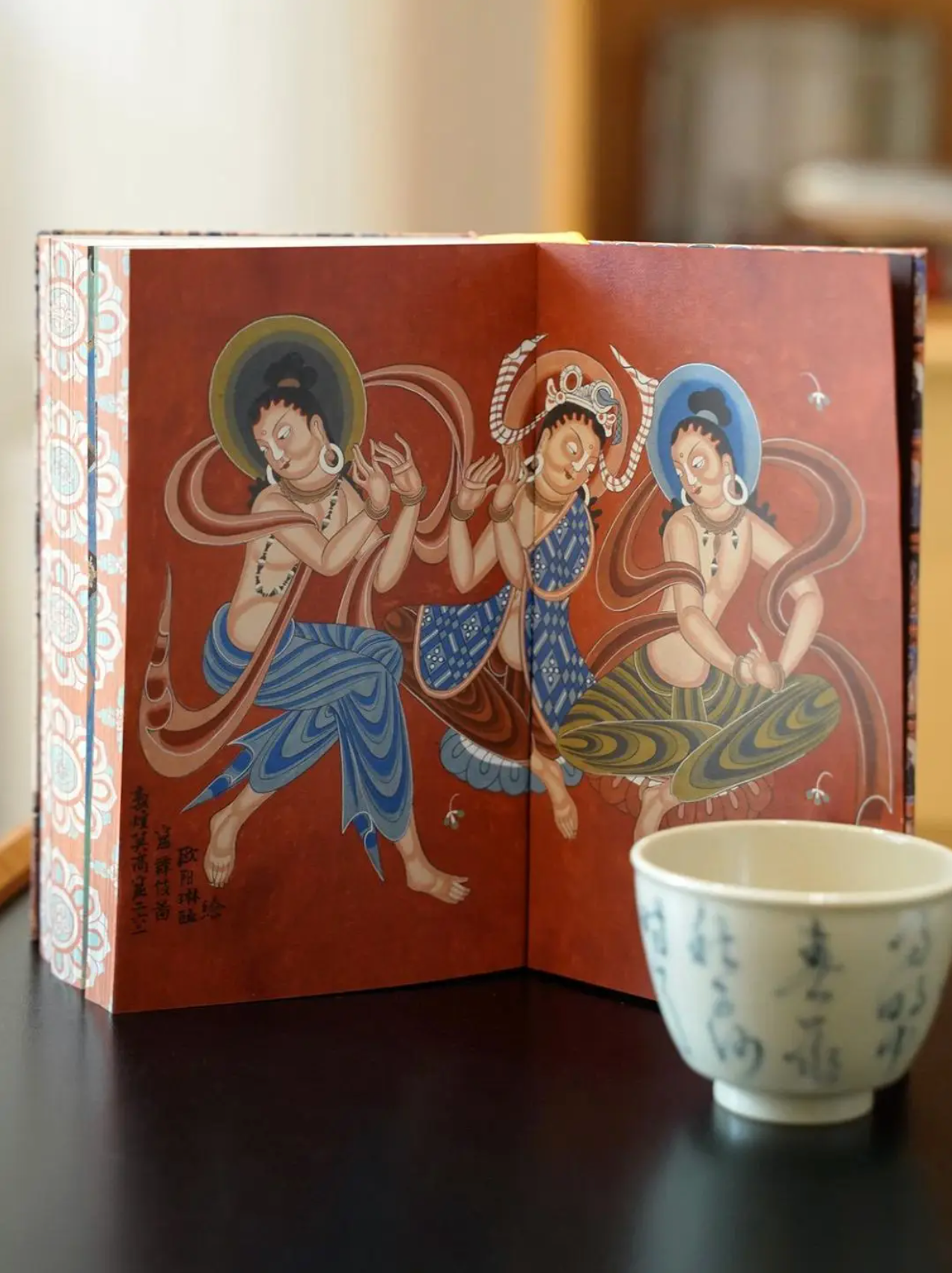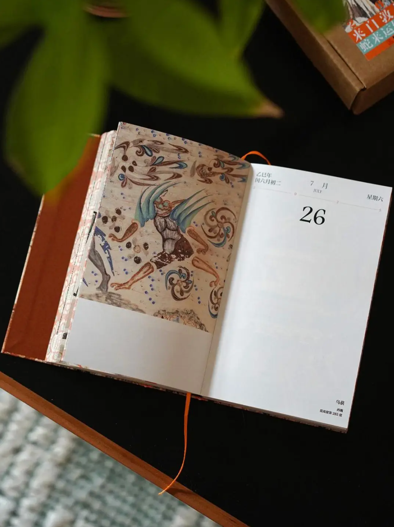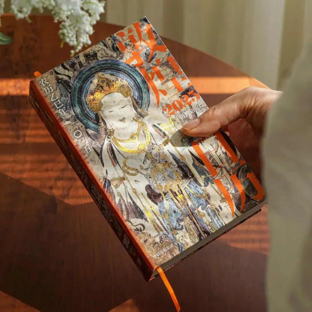 2025甄选收录295幅实景壁画、70幅专家临摹复原作品,从神佛护佑、经变故事,到传统建筑、服饰妆容、世俗生活,收录大量难得一见的未开放洞窟与未公开遗珍素材。菩萨低眉、天王威仪、金刚怒目、伎乐踏歌……看见久已逝去的异域世界,看见繁多人物、富丽场面、瑰丽色彩、纯熟技巧。元旦节,敦煌文献有“三阳始布,四序初开”的记载,开此日金刚萨埵菩萨,传递无坚不摧的力量; 上元节(正月十五),敦煌文献记载“灯笼火树,舞席歌筵” ,此日《琳琅宝座图》,彩云围绕、飞天散花,彰显繁复华丽; 敦煌文献中有“阳爻始动,万物生芽”,此日《好友小酌图》,晚来天欲雪,能饮一杯无。 年末,敦煌文献记载“长至初启,佳节应期”,此日祈愿来年事事顺遂 山中郊游、消暑游泳、酒肆小聚、孩童摘花、屋中读书、林间打猎… …Chinese: 千千世界,万象人间。来自敦煌的吉祥与祝福,相伴365日。