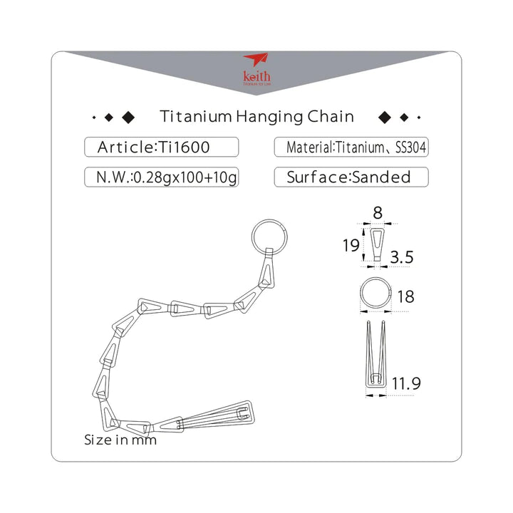 悬架链由纯钛制成,没有衬里和优质涂层。它无味无毒。该链条最初专为远足、露营和旅行而设计,非常适合野餐。钛超轻超强;它对环境友好,生物相容性和细菌抑制作用;它还具有极低的过敏性,并且具有出色的耐腐蚀性。