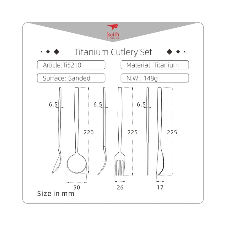 钛餐具套装由纯钛制成,没有衬里和优质涂层。它无味,无味,无毒。这款马克杯最初专为远足、露营和旅行而设计,也是野餐、家庭和办公室的理想选择。钛超轻超强;它对环境友好,生物相容性和细菌抑制作用;它还具有极低的过敏性,并且具有出色的耐腐蚀性